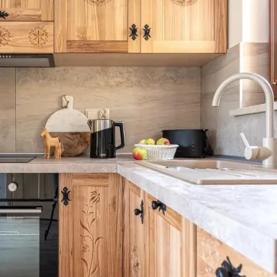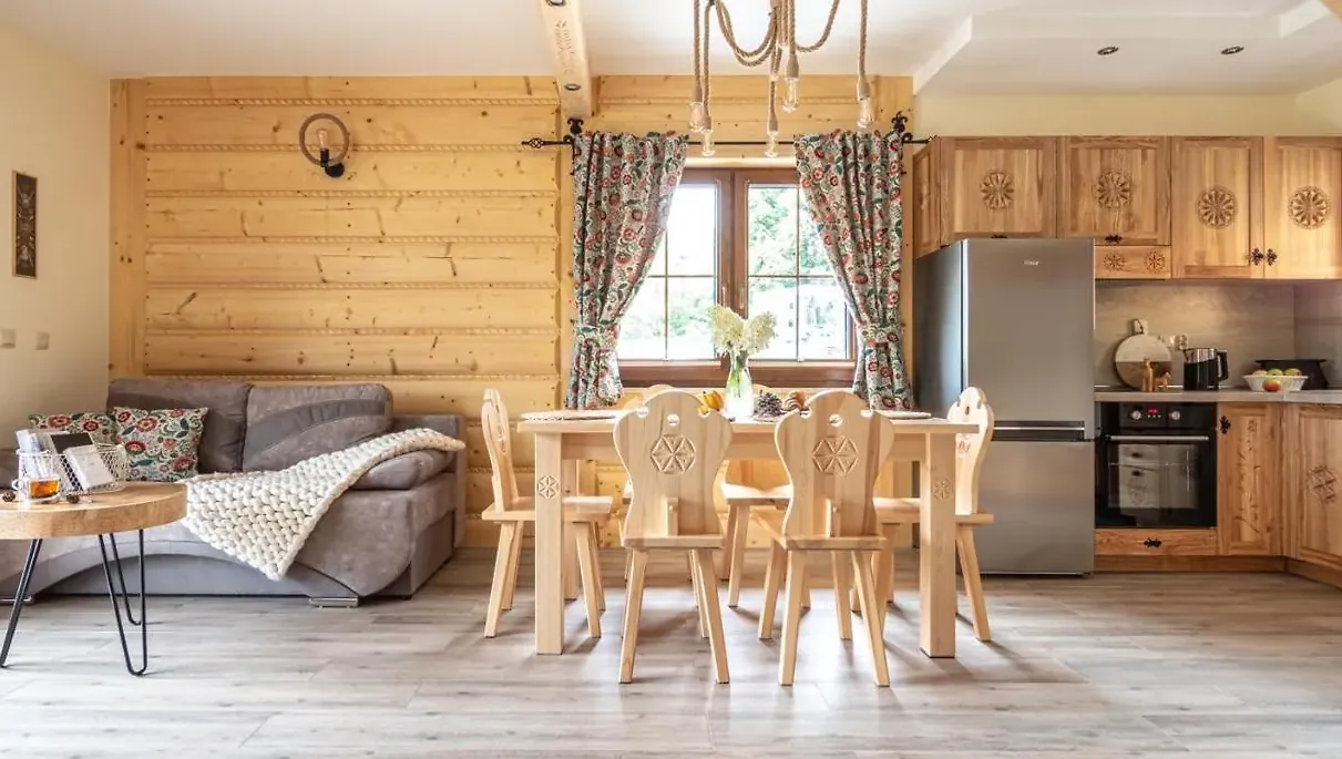 W stylu góralskim. Meble, krzesła i stoły są ozdobione w regionalne motywy. Znajdziesz tutaj pełne wyposażenie kuchni.